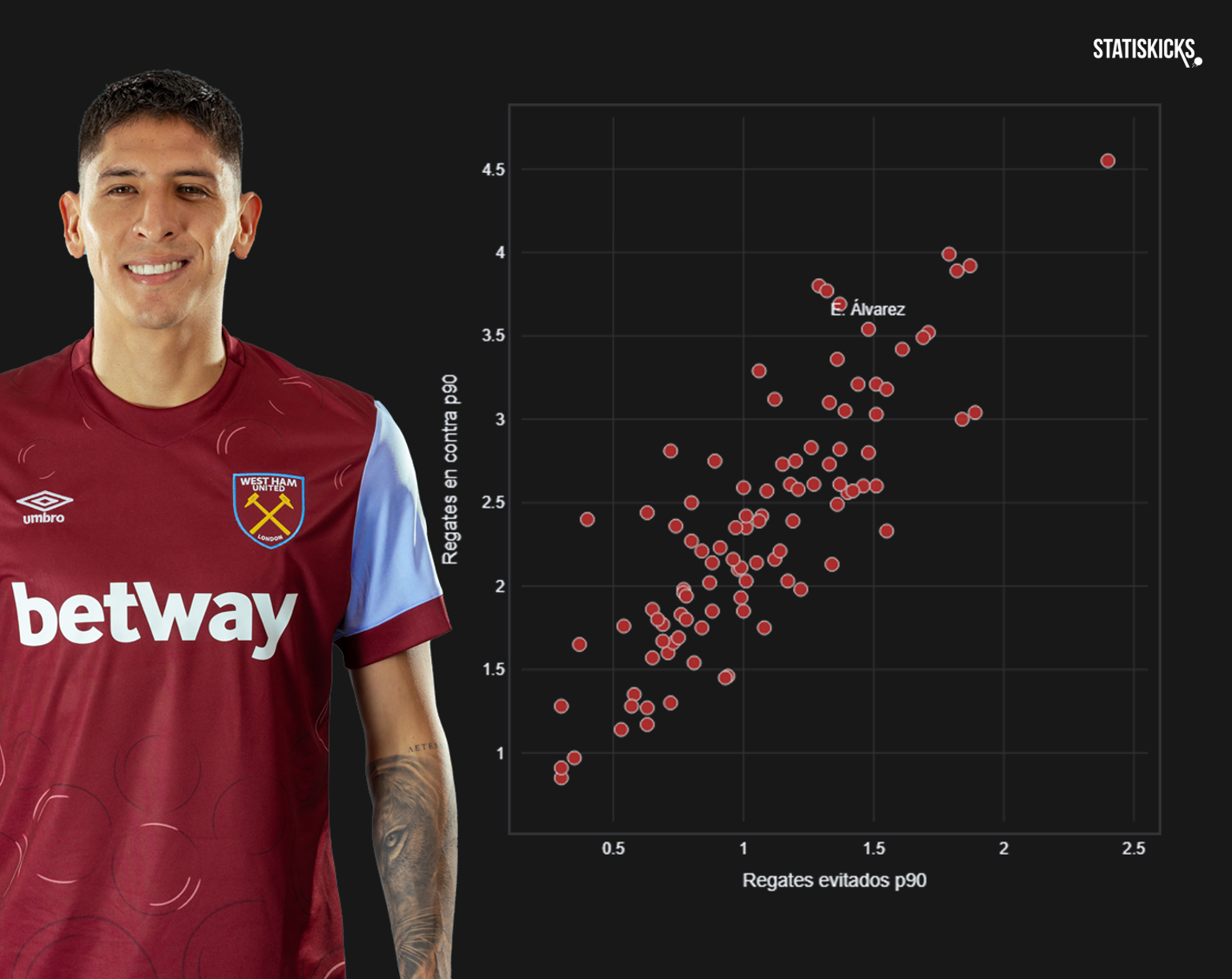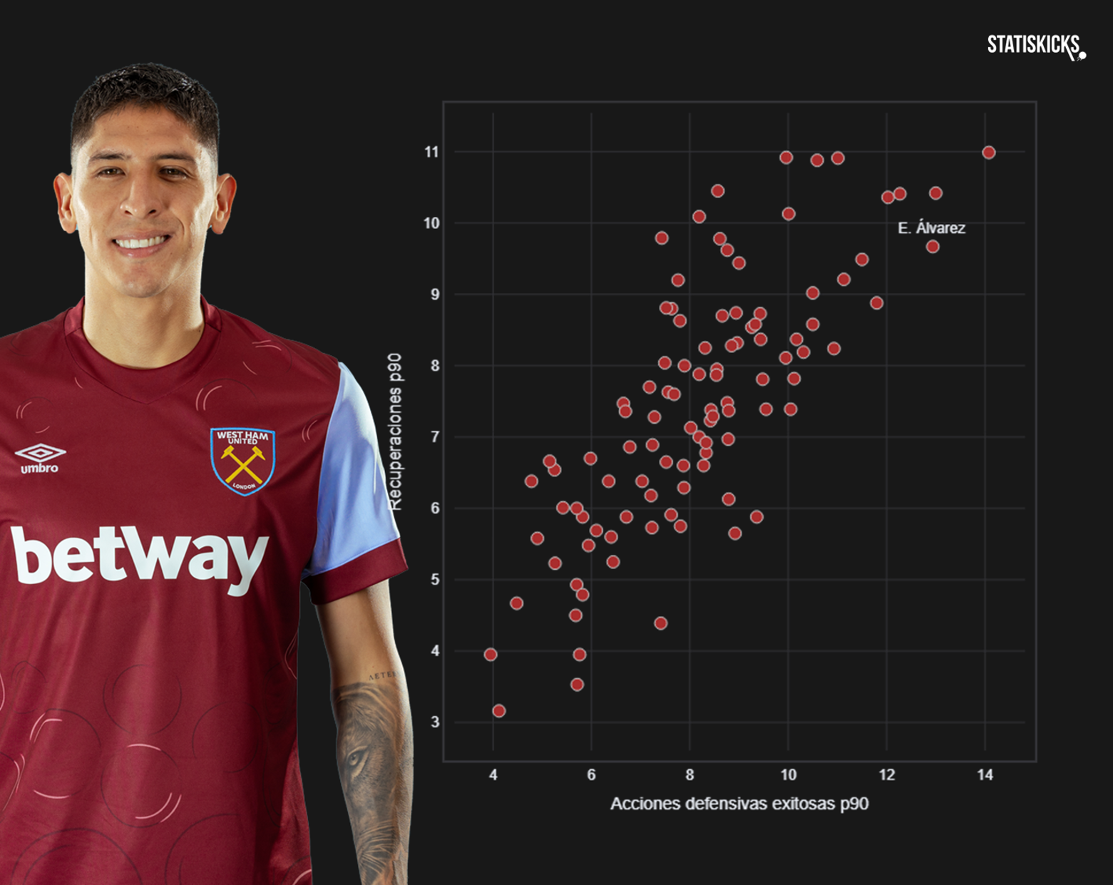 Si analizamos su capacidad de recuperar el balón, vemos que también destaca. Obviamente, hay que asociarlo, otra vez, al bloque bajo del West Ham siendo más reactivos que preventivos. Obligando a Edson a trabajar en demasía defensivamente. El valor añadido es que generalmente recupera la posesión después de una acción defensiva, algo que no es una regla escrita, pero que Álvarez lo hace bastante bien como se muestra en el siguiente gráfico de dispersión: