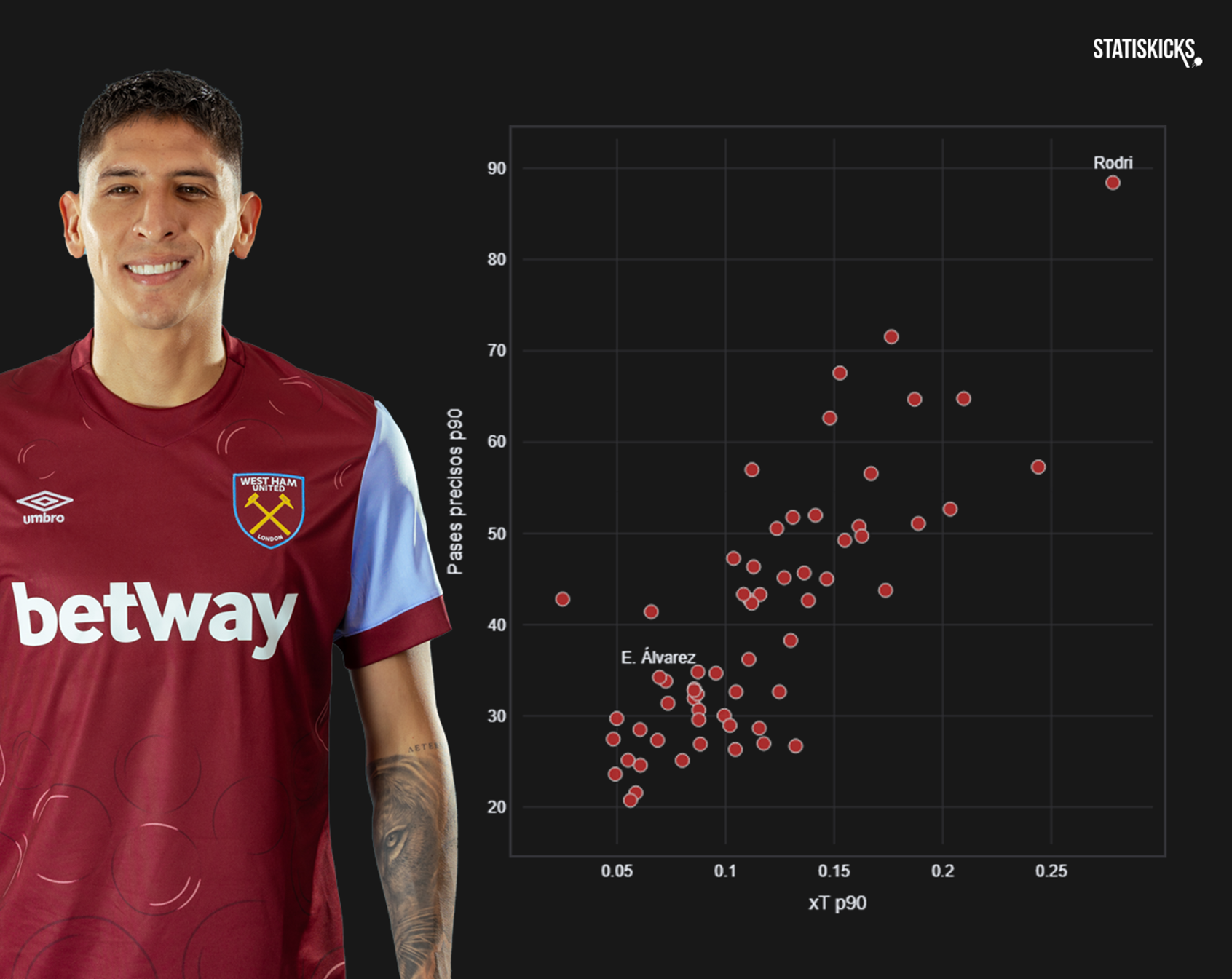 La idea de incorporar a un futbolista del corte de Edson seguramente pasaba por poder sumar un perfil defensivo al centro del campo, luego de la marcha de Declan Rice, quien, por cierto, es muy diferente al mexicano. Al final, el club del este de Londres acertó con su fichaje para no perder solidez, y otra forma de ejemplificar el gran encaje de Álvarez en el West Ham. Aunque, si bien es cierto, Edson no ha podido dar la salida o construir juego como lo hacía con Ajax, mucho menos progresar. Y es que el entorno de transiciones rápidas del West Ham no se lo permite. Si vamos de vuelta a su radar, su precisión de pases está por encima de la media. Por lo que podemos inferir que, no arriesga pases, pero tampoco los erra.
